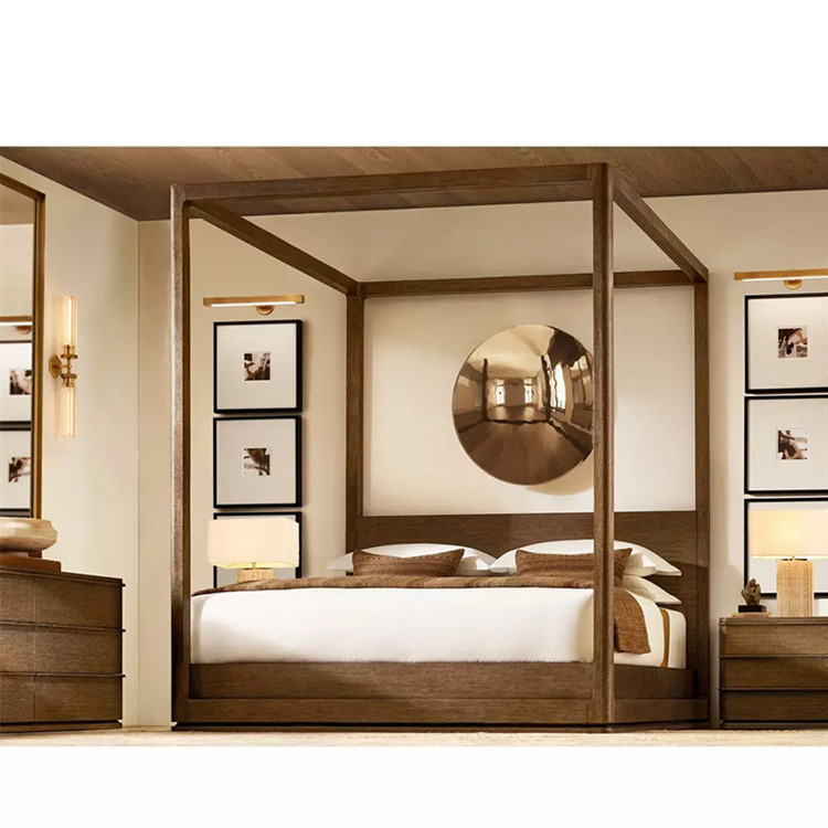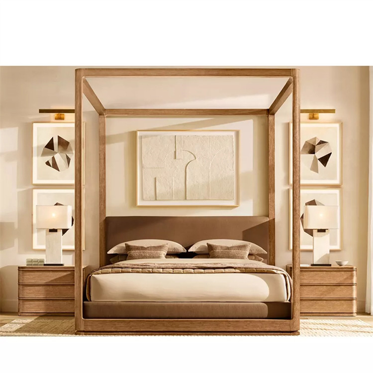 Luxury French Style Solid Oak Wood King Bed Frame Hand Carved European Design with Canopy Reed Style